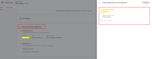 À l’étape suivante de la mesure et des objectifs, Google vous demandera de lier Google Optimize à l’un de vos comptes Google Analytics. Choisissez-en un dans le lien et il sera sélectionné :