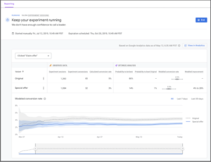Maintenant, une fois que vous avez tout configuré et que vous exécutez vos tests A/B, vous pouvez faire une pause et attendre les résultats. Ne vous attendez pas à les voir immédiatement, car il faudra plus d’une semaine pour voir des résultats normaux sur votre page de résultats, qui ressemblera à ceci :
